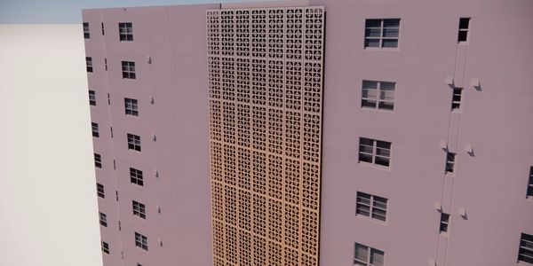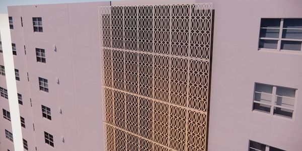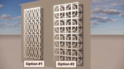 Each design is shown here side by side. Option #1 on the left and Option #2 on the right. There is no difference in the cost of the two designs. The architectural metal wall will be made up with 7 panels side to side and 14 panels bottom to top. The panel will be mounted ~6" out from the balcony slab to allow for more airflow. There will be a another screen layer mounted flush to the balconies to prevent birds from getting in. A metal handrail will be installed on each balcony for added fall protection.