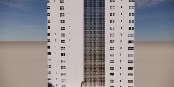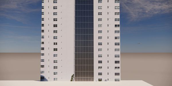 The colors shown in the images are not representative of the color of the finished product. The architectural metal will be painted a light gray color. The balcony beams will be a darker gray color to contrast and highlight the architectural metal wall.